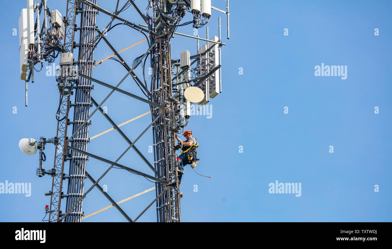 Telecom Maintenance Man Climber On Tower Against Blue Cloudy Sky Background Telecommunication Mast Station Tv Antenna Wireless Technology Stock Photo Alamy